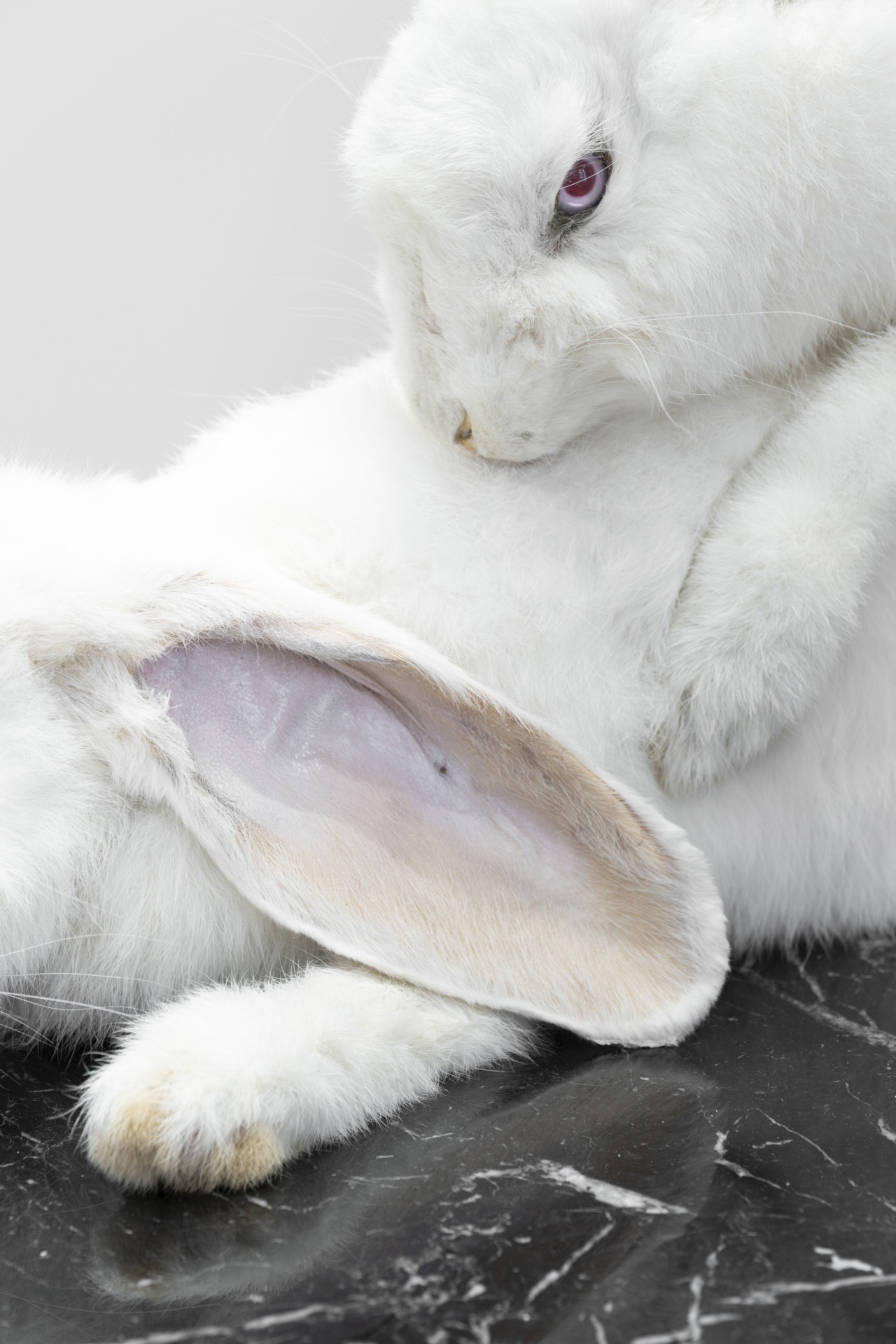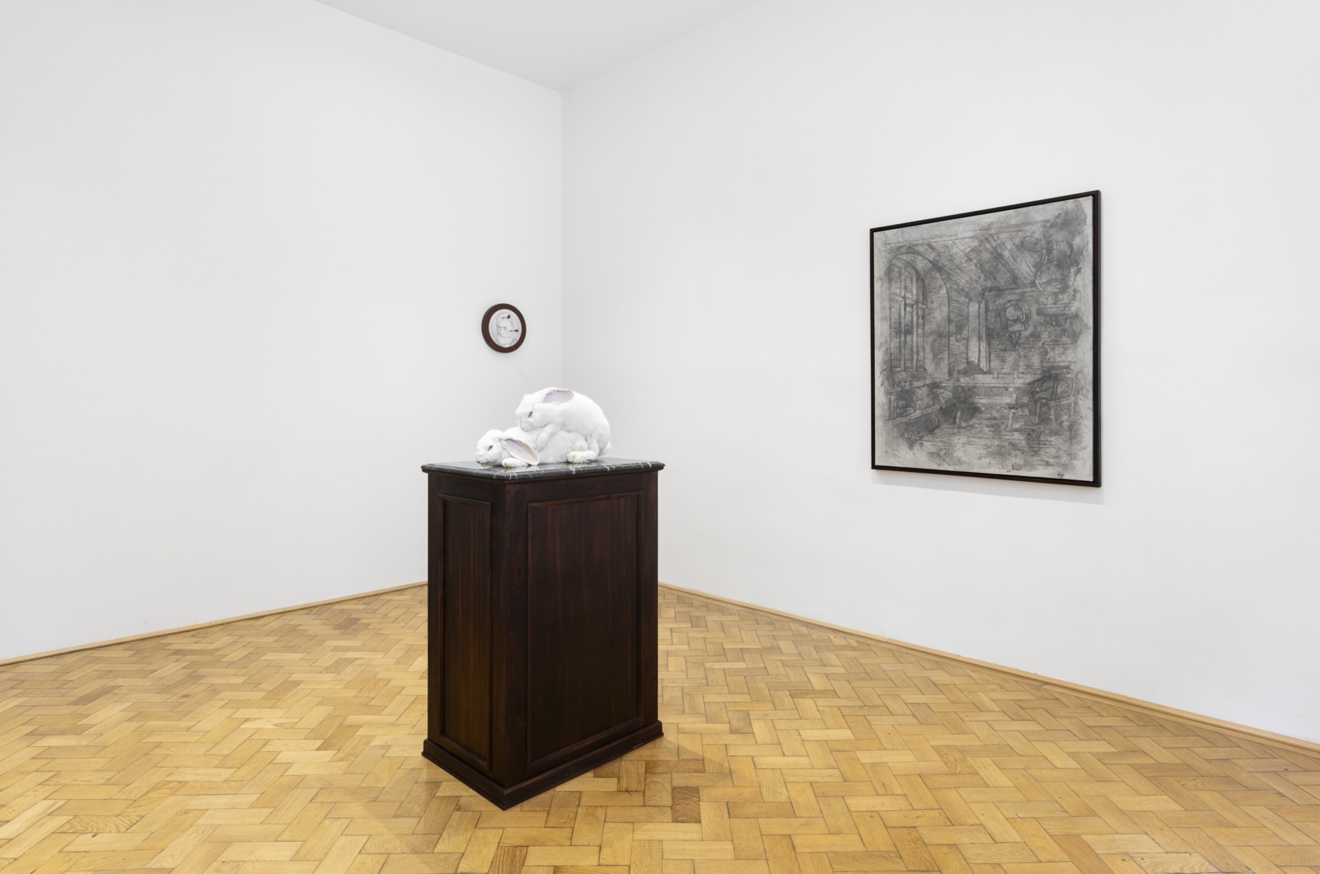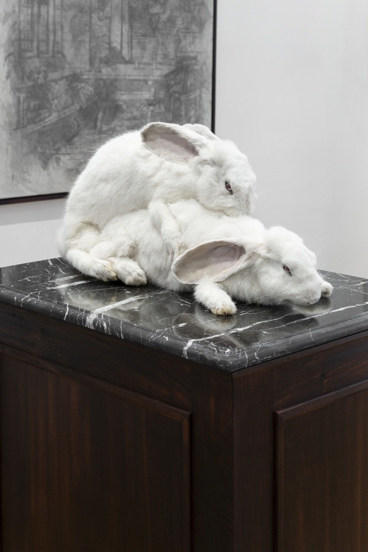În acest punct apare și interesul lui Ciurescu. El construiește o constelație de imagini neliniștitoare provenite din contexte disparate – Europa de Est și Occident, iconografie religioasă, psihanaliză & cultură corporatistă –, fiind interesat în special de momentele când puterea devine indisciplinată, când se autodepășește sau se suprastimulează, ceea ce o face să‑și piardă autoritatea directă, deși rămâne prezentă. Această dinamică este evidentă în L’Eterna Urgenza (2026), o sculptură care înfățișează doi iepuri în actul copulației, punând în scenă o obscenitate animalică și o profanare într‑un spațiu simultan teatral, științific & banal.