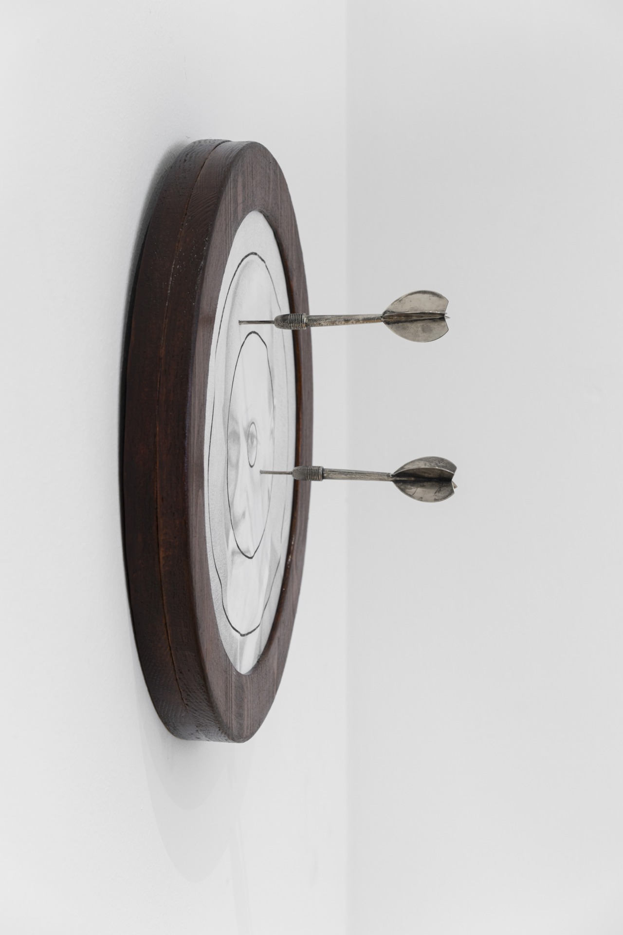 ELEGIA, prima mea expoziție personală la Viena, descrie momentul când descoperi că Moș Crăciun nu există, dar te afli într‑un loc unde nu poți să spui ce ai descoperit. Mi‑am dorit ca lucrările să încorporeze dualitatea dintre un pumn și un sărut. E și primul moment în care limbajul meu s‑a coagulat cu adevărat ‒ așa am reușit să mă eliberez de o anumită „ortodoxie” vizuală și să reduc proiectul la patru lucrări. Pe care le‑am gândit ca pe niște piese extrase dintr‑un mediu burghez, cu ochii pe contextul Vienei și pe moștenirea ei imperială, indicând discret referințele care îmi definesc practica și care îmi ghidează alegerea tehnicilor.