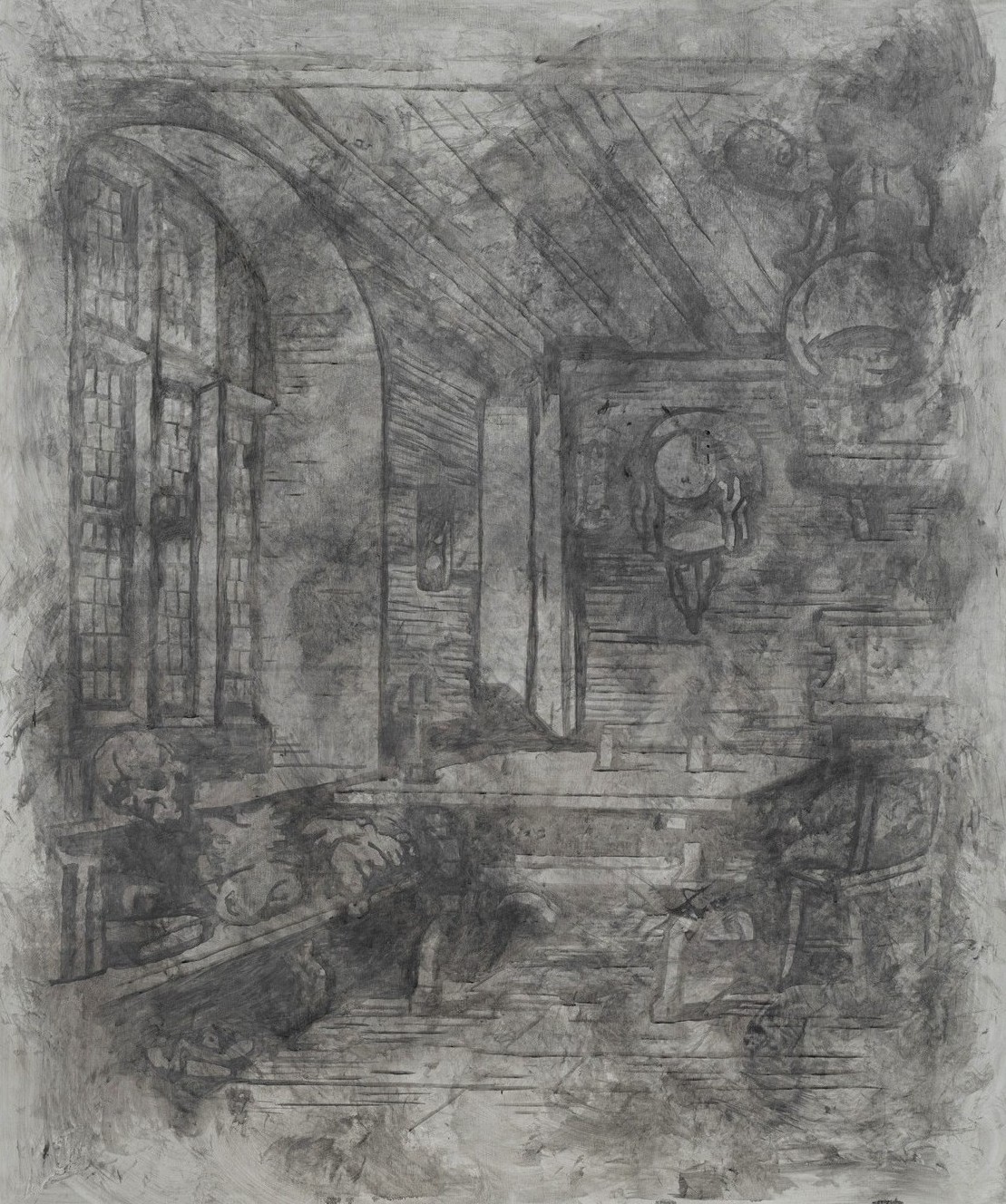 Sunt imagini care vorbesc despre modul în care funcționează dorința și pulsiunea morții într‑o societate lipsită de proiecte emancipatoare, în care fascismul proliferează și fanteziile masculine de dominație prind rădăcini. Subiecți considerați odinioară centre stabile ale lumii încep să dispară – e cazul subiectului din gravura în lemn Sfântul Ieronim în cabinetul său (1514) de Albrecht Dürer, care, în reinterpretarea lui Ciurescu, Sfântul Ieronim a plecat (2026), nu mai este prezent. Subiectul stabil este astfel erodat, pe măsură ce munca, cercetarea și disciplina se retrag.