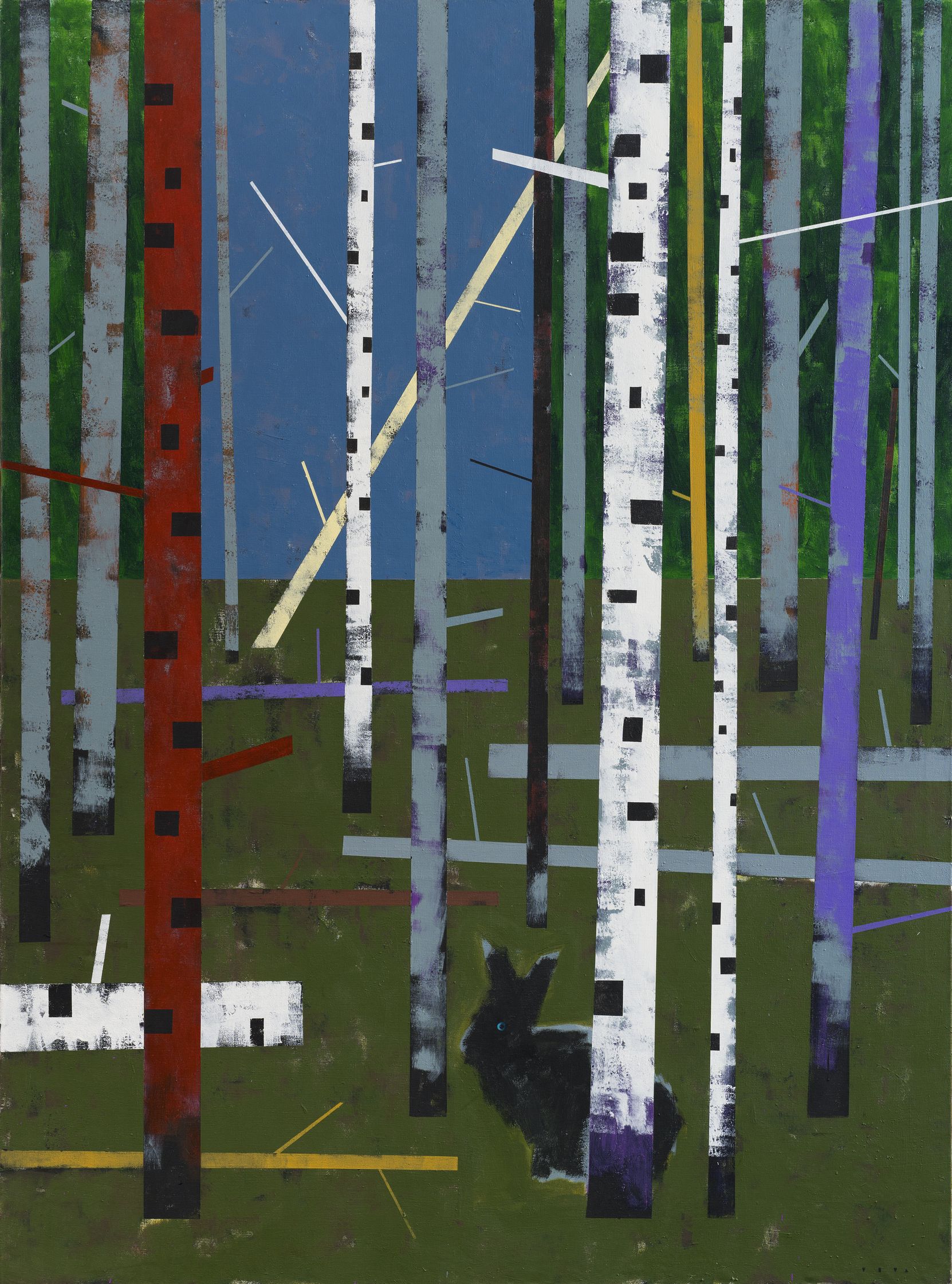 Uladzimir Sakalouski lucrează cu un limbaj vizual deliberat minimalist, aproape diagramatic. Fabrici, case, păduri de mesteceni, scaune, câini și corbi – toate sunt construite din unghiuri ascuțite și suprafețe plate de culoare, amintind de ilustrațiile din cărțile pentru copii, de designul modernist timpuriu și de estetica afișelor politice.